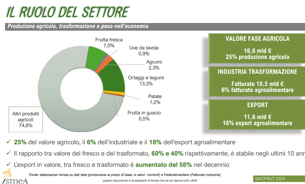 Al centro di tutto c’è la filiera dell’ortofrutta, settore strategico dell’agroalimentare italiano. Secondo i dati Ismea la produzione ortofrutticola 2023 è stimata in circa 24 milioni di tonnellate su una superficie di circa 1,3 milioni di ettari coltivati a frutta e verdura, per 300 mila aziende coinvolte.